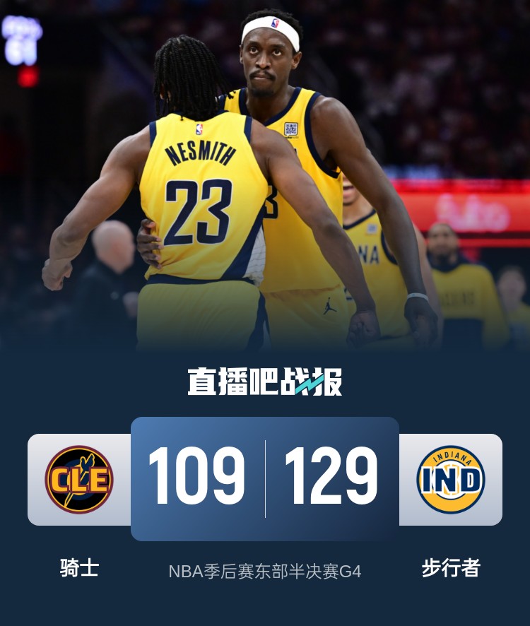 首节之争步行者早早进入状态上来就是一波7-0的攻势迅速确立起领先,骑士上来就打得被动完全找不到感觉,节中特纳和托平连续飚进三分,步行者送出一波17-4的攻势一举拉开两位数分差;作为季后赛至今场均得分和进攻效率双双第一的球队,骑士却在第二节彻底哑火仅得16分,步行者彻底起势势不可挡,上半场他们送出25次助攻配合丝滑流畅,10人轮换除了被驱逐仅出场1分的马瑟林外其余9人均有得分;骑士方面上半场命中率仅为25%导致崩盘,步行者爆砍80分的同时拿到平季后赛纪录的41分领先优势进入下半场。下半场归来米切尔没有出场退出比赛,第三节骑士找回感觉单节轰出38分,奈何上半场挖坑太大单节也只追回9分无力制造太大威胁,末节双方也基本替补对决早早鸣金收兵。最终,步行者主场大胜骑士夺得赛点。