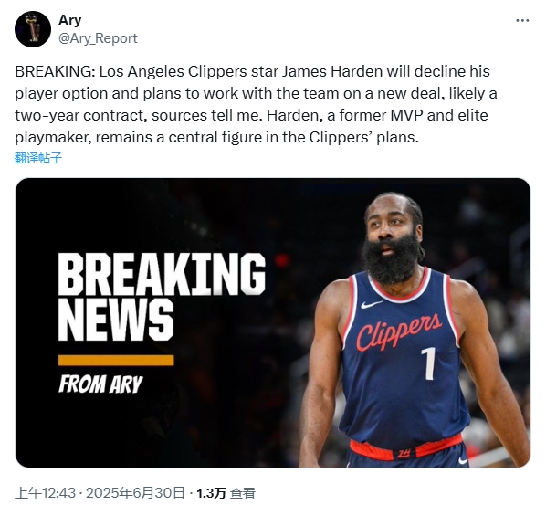 06月30日讯 据记者Ary报道,洛杉矶快船球星詹姆斯-哈登将拒绝执行球员选项,并计划与球队签订一份预计为期两年的新合同。这位曾获MVP的顶级组织核心,仍是快船未来建队规划中的重要核心。