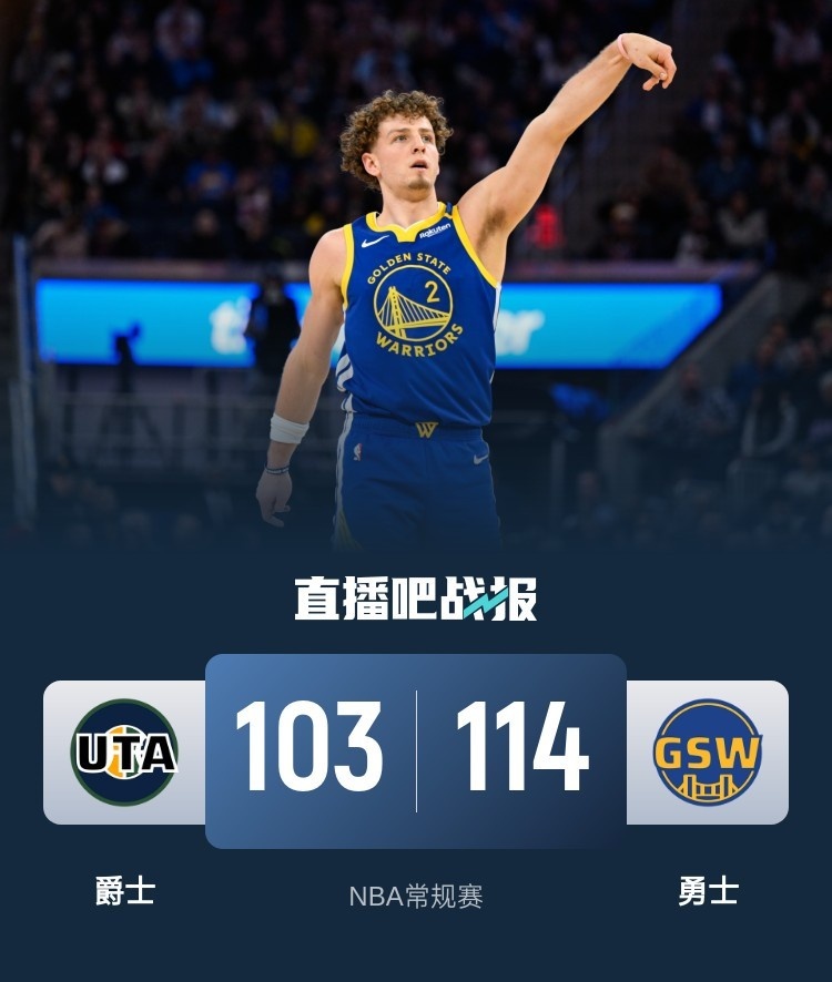 比赛开始,双方都迅速进入状态展开拉锯战,塞克斯顿有攻有传带队建立主动权,维金斯里突外投一度反超,科利尔压哨上篮助爵士扳平比分,次节勇士上来9-0拉开比分,但塞克斯顿单节得分上双助爵士回应止血,勇士全民皆兵半场依然领先双位数。下半场,塞克斯顿继续带队追分,但维金斯接连三分回应守住领先,施罗德有些崴脚但好在无碍,双方围绕着10分左右分差展开拉锯战,末节勇士进攻端停滞,爵士一波13-3小高潮一度追到差1分,穆迪和波杰姆斯基接连三分止血,勇士重新拉开双位数领先,最终勇士114-103力克爵士,送对手7连败。