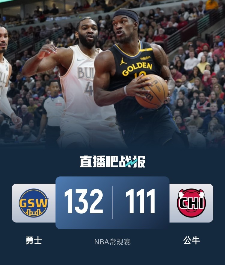 比赛上来,勇士进入状态较快,巴特勒更是用一记精彩空接暴扣拿到新东家首分,整个第一节公牛虽然紧咬比分却没有获得反超机会,次节场上局势突变,勇士在前四分钟的时间里一分未得,公牛趁势轰出一波15-0的攻势,不但实现反超还建立起两位数的领先优势,半场结束时勇士落后14分;下半场回来勇士又是表现慢热,公牛连拿八分将分差扩大到二十分以上,紧要关头库里站了出来连中三分,勇士一波12-0的小高潮迅速止血,三节结束时他们已经完成了24分的大反超,末节巴特勒个人连拿七分带队将分差拉开到两位数,公牛此后毫无起色,最终勇士逆转公牛结束连败。