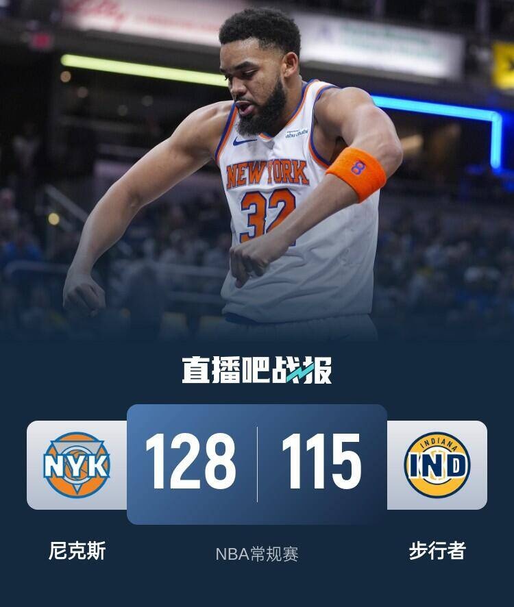 开场后两队就打得十分胶着,在第一节后半段西亚卡姆和马瑟林联手打出一波小高潮取得领先,不过尼克斯立马回敬一波10-2以1分优势结束首节。第二节上来步行者率先打出攻势,唐斯带队强势回击,唐斯状态火热单节轰下15分,麦克布莱德在三分线外也总能给予支援。易边再战,布伦森受犯规困扰早早下场休息,唐斯依旧打得十分坚决,哈特也站出来频频拿分帮助尼克斯将分差拉大到两位数,步行者多点开花追赶比分。最后一节唐斯和哈特帮助球队始终掌控场上局面,步行者未能缩小分差,最终尼克斯击败步行者。