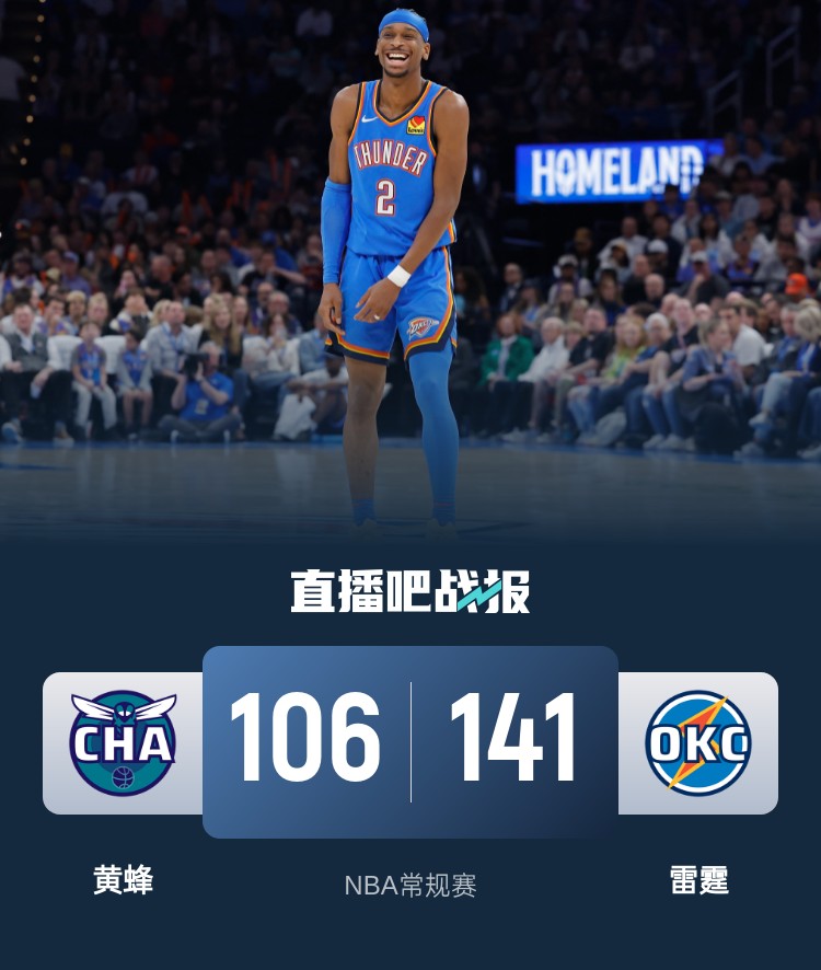 比赛上来,场上就呈现出一边倒的局面,黄蜂进攻毫无章法半节仅拿4分,而雷霆这边外线频繁开火,首节就领先了20分,次节黄蜂终于找到外线手感,连续命中三分后单节轰下35分,但分差并没有缩小太多,半场结束时雷霆仍领先17分;下半场回来,黄蜂的外线手感还在,分差一度缩小到10分,雷霆及时叫停后回应一波18-0的攻势直接打花比赛,末节早已进入垃圾时间,最终雷霆大胜黄蜂迎来五连胜。