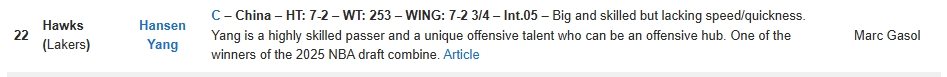 文中写道:“杨瀚森是一位独一无二的球员,他身材高大、技术精湛。他的控球和传球能力出色,篮下手感极佳。他既能担任进攻核心,也能担任控球中锋,为进攻增光添彩。”