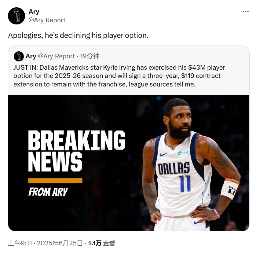 但名记Shams随后报道(过了11分钟)的则是,欧文拒绝了4300万美元球员选项,然后与独行侠3年1.19亿美元续约(最后一年为球员选项)。也就是说Ary的报道对了后面的一半(但Shams更早报道欧文与独行侠的续约合同将低于年薪4000w美元)。