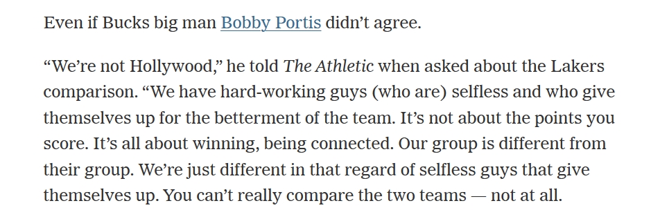 “我们不是好莱坞,”当被问到雄鹿和湖人的比较时波蒂斯说道。“我们有一群努力且无私的球员,大家都愿意为团队的进步做出自己的牺牲。重要的不是你自己得了多少分,重要的是球队的胜利、团结。我们的团队和他们不同,不同之处在于我们更乐于无私奉献。你没法去比较这两支球队,根本没有可比性。”